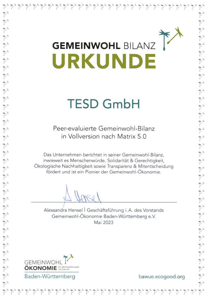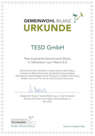 Am Dienstag 9. Mai 2023 erhielt ULDE im Stuttgarter Rathaus offiziell ihr Gemeinwohl-Ökonomie-Zertifikat. Damit ist das Ulmer Unternehmen Gemeinwohl-Pionier als eines von rund 1.000 Unternehmen weltweit, die freiwillig eine Gemeinwohl-Bilanz erstellen und einen Gemeinwohl-Bericht veröffentlichen. Neben Nachhaltigkeitsthemen setzt der Geschäftsführer Roland M. Eppelt vor allem auf die gesellschaftliche Wirkung freier Software. Die Bewertung mit 532 von 1000 möglichen Punkten zeigt das hohe Engagement der TESD GmbH für das Gemeinwohl.